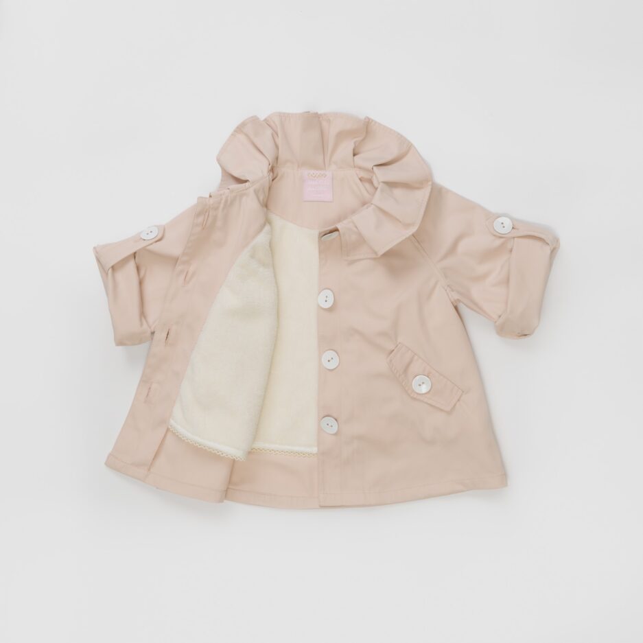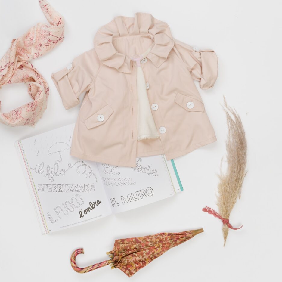Raincoat in water resistant fabric with three-quarter sleeves, sunburst collar, bamboo velvet lining and enamelled mother-of-pearl buttons