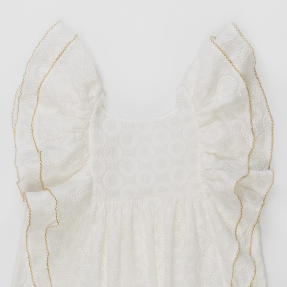 Abito in pizzo di cotone con ruches ed inserto smerlato dal profilo dorato